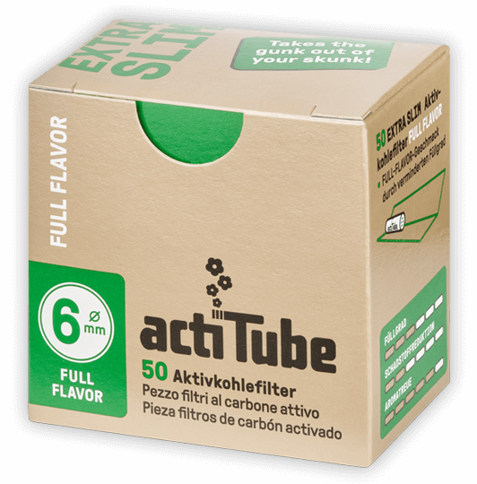 Filter s aktivnim ugljenom punog okusa samo je napola napunjen aktivnim ugljenom. Kao rezultat toga, filtrira se znatno manje zagađivača, a okus postaje grublji. Sa svojih 6 mm, to je najmlađi i najmanji član obitelji actiTube. Zbog blagog okusa naših filtera s aktivnim ugljenom od 7 mm i 8 mm, ljudi često uzimaju prevelike dimove. To uzrokuje pregrijavanje spoja. S punjenjem od 50% PUNOG OKUSA, dim ima intenzivniji okus, a dovoljni su i mali udisaji za jak okus.